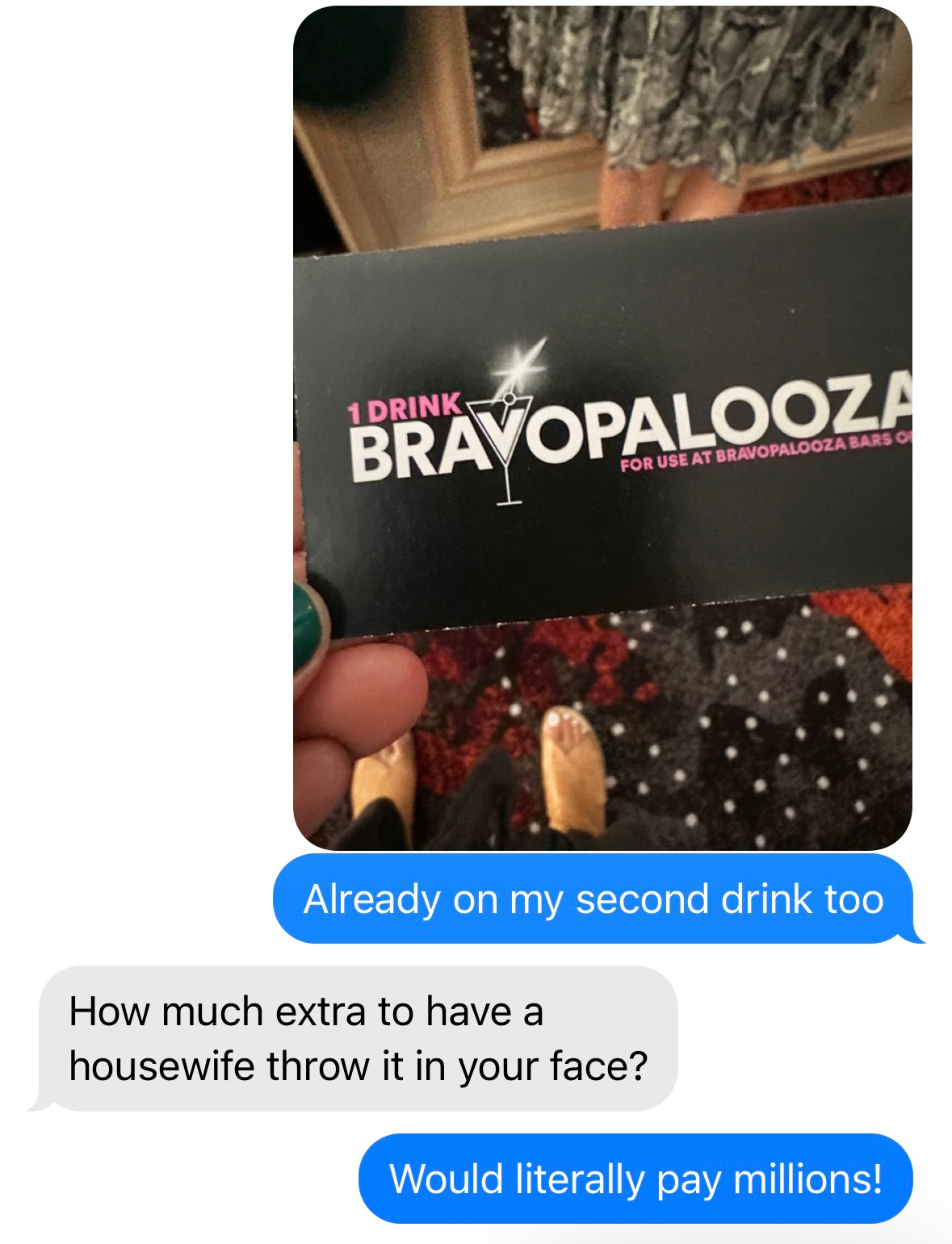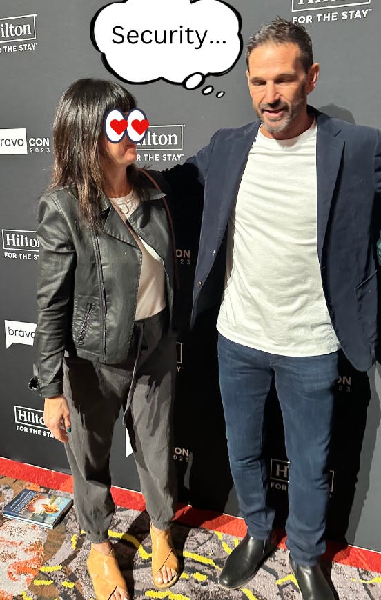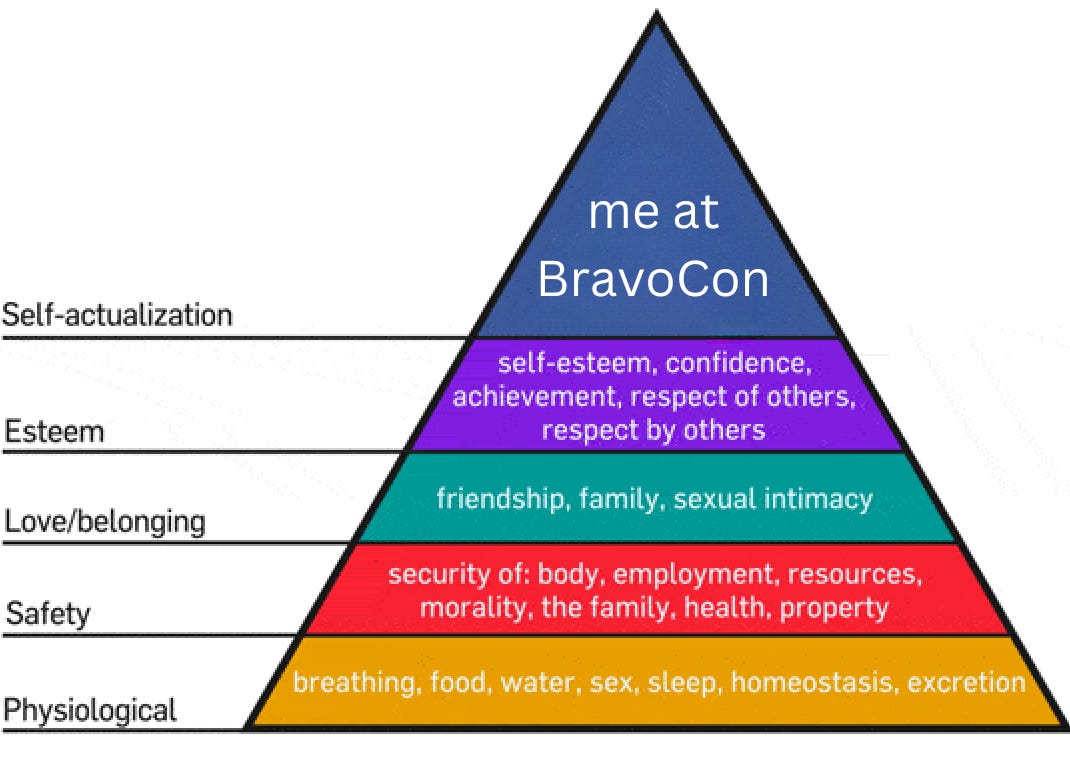 Everything was catered to the Bravo fan. I know you’re thinking, "Duh. Hasn’t this dumb dumb ever been to a convention? That’s the whole point!” YES I HAVE. But not one where I was the fan! This show did everything right. It was all winks and nods and inside jokes. It was clever, IP infringing Etsy t-shirts and women with Drybar blowouts and sequin pants, and a bar shilling themed cocktails every six feet. We even got to cast ourselves in some classic Bravo moments!
